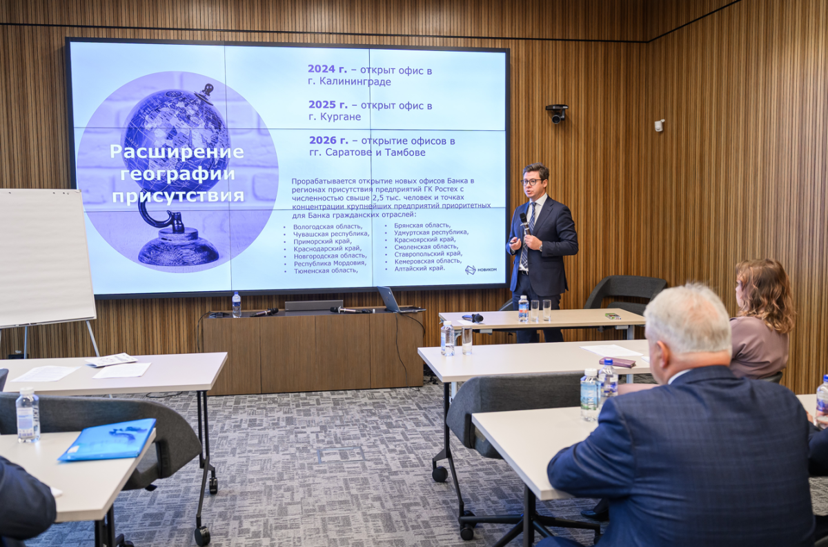 В своем выступлении старший вице-президент банка Максим Розов рассказал о перспективах НОВИКОМа по расширению географии сети. Банк рассматривает возможность открытия новых офисов в городах присутствия предприятий Ростеха с численностью сотрудников от 2,5 тысячи человек и в местах концентрации производств приоритетных для банка гражданских отраслей.