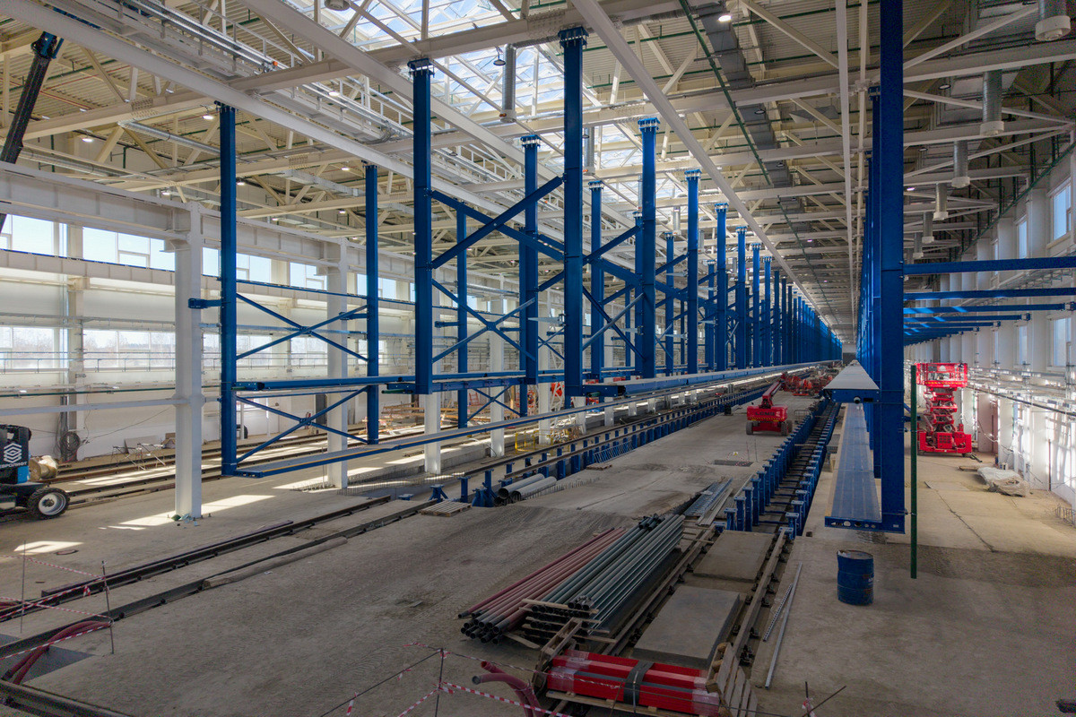 В корпусе для проведения пусконаладки электропоездов, длина которого составляет 378 метров, ведутся устройство системы пожаротушения, укладка железнодорожных путей, внутренние отделочные работы, монтируются слаботочные и электрические сети.